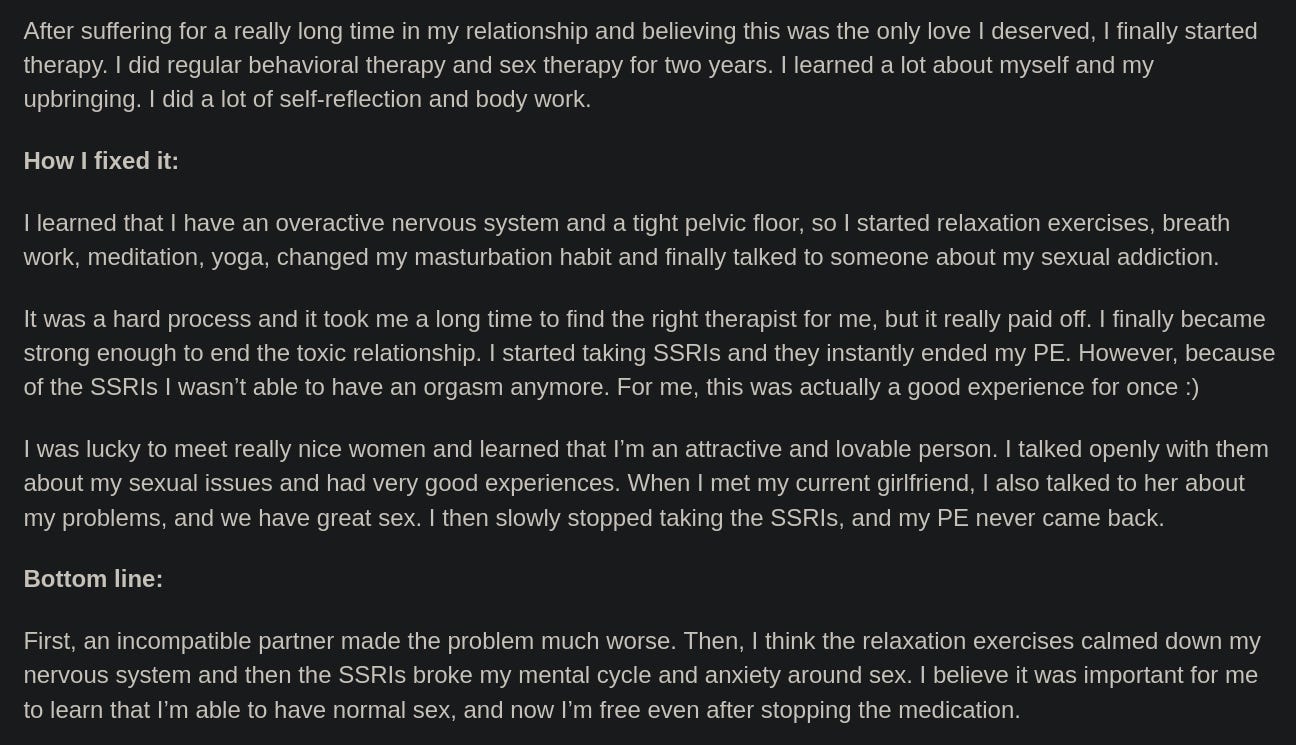 There are many more testimonies like these. As you can see, the thing they have in common is behavioral techniques, and in particular training the nervous system to regulate and training the pelvic floor and surrounding areas to relax.