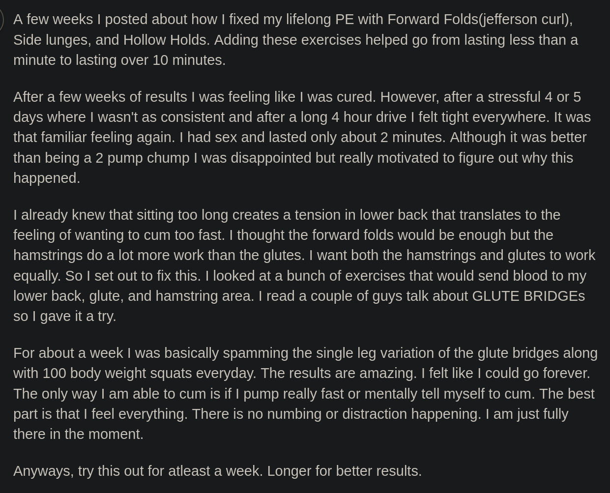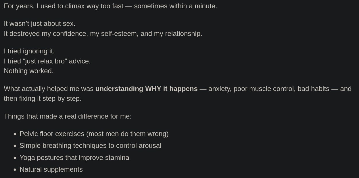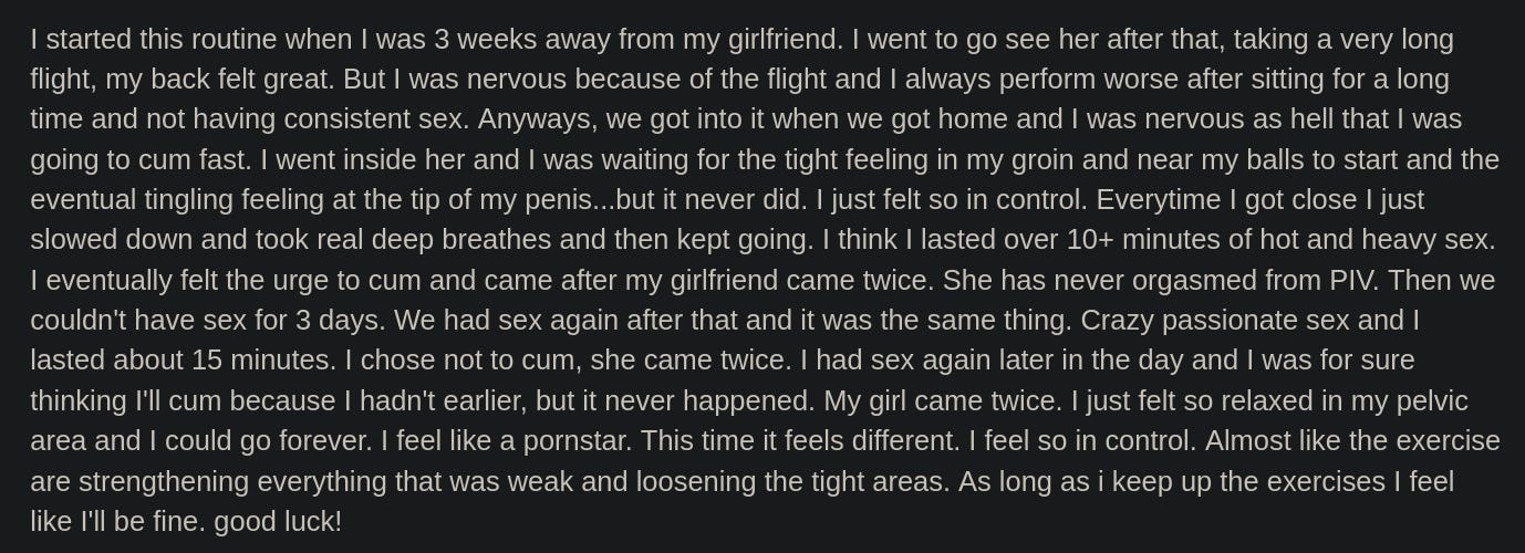 For anyone interested, I teach the science of ejaculation control to men in one-on-one video calls. The teaching includes a complete set of solutions to fix PE: pelvic floor muscle training, body exercises, breath exercises, stretching of muscles involved in PE, and other behavioral techniques.